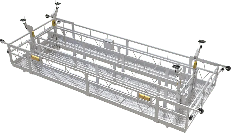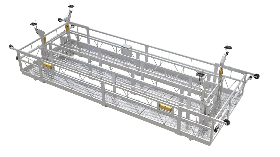 免搭脚手架的组合悬吊平台,只须要在锅炉顶部预留孔放下4组钢丝绳通过提升机带动平台升降