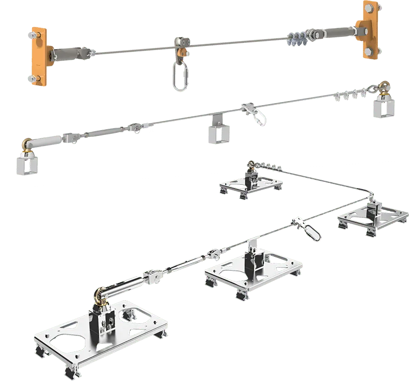 水平生命线按照人员移动需求沿途布置,可直线可曲线。人员沿生命线移动时,移动锚点无需断开可直接滑移通过钢丝绳支撑。